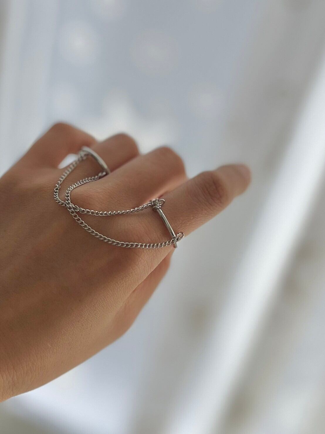 二つのリングをチェーンで繋いだデザインが印象的なアイテム。