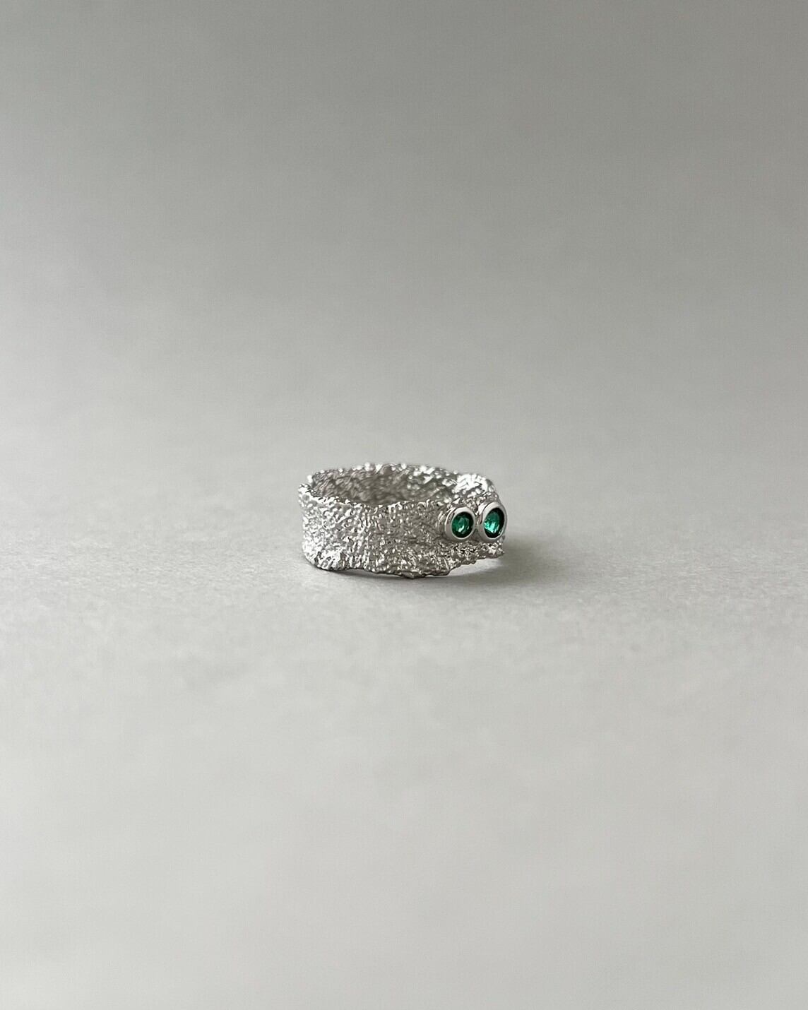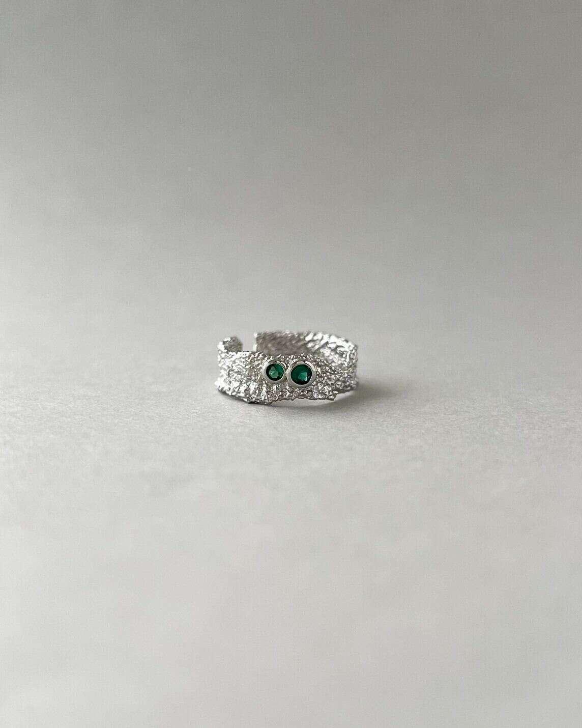 細かくアルミニウムのような特徴的な質感にグリーンのストーンが映えるリング