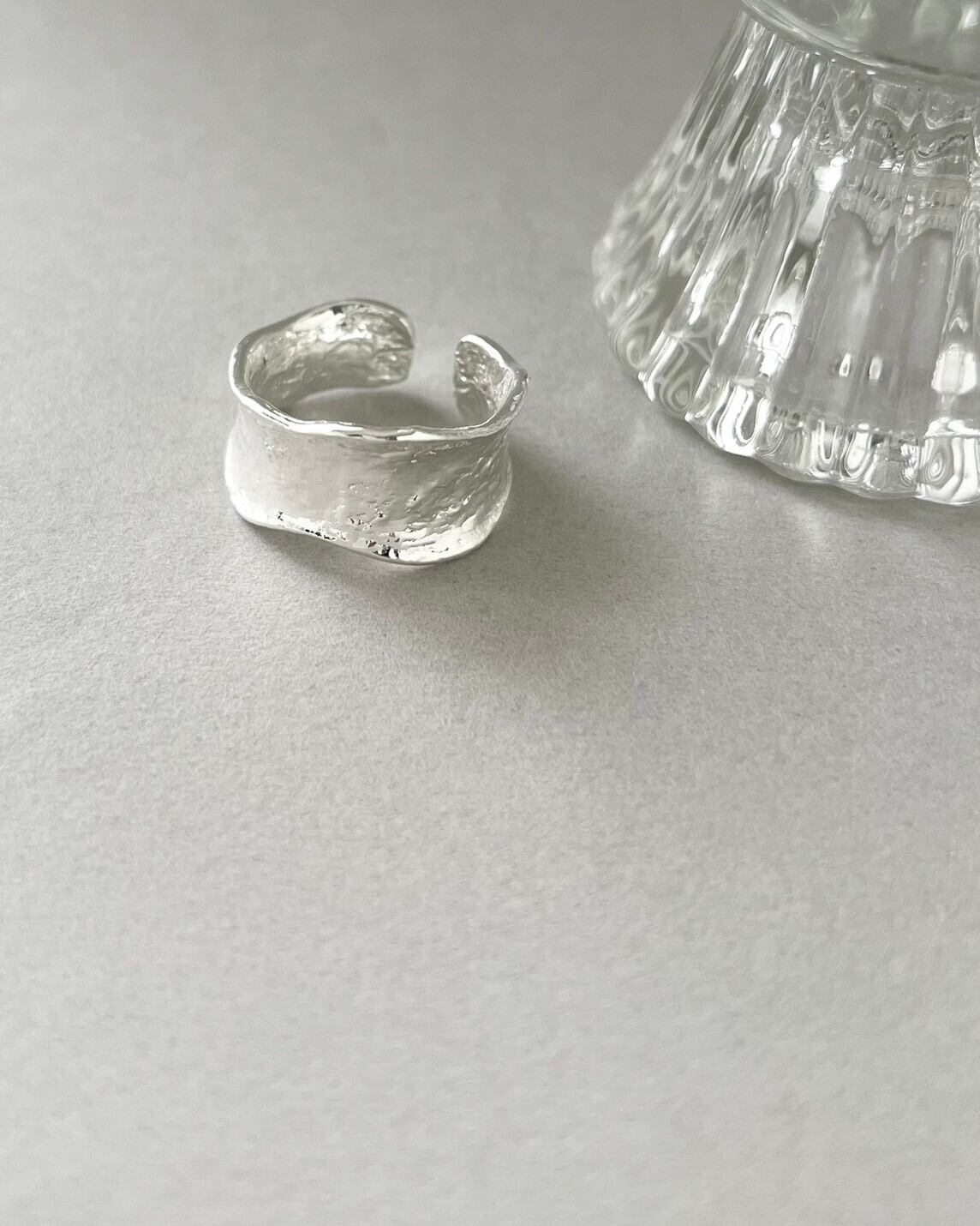 アルミニウムのような粗い地表のようなデザインが目を惹くリング。