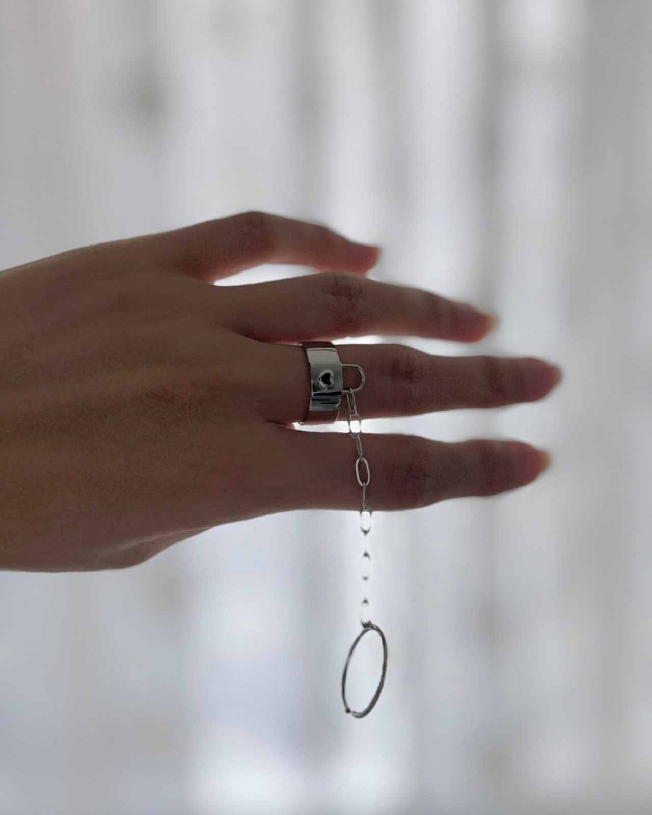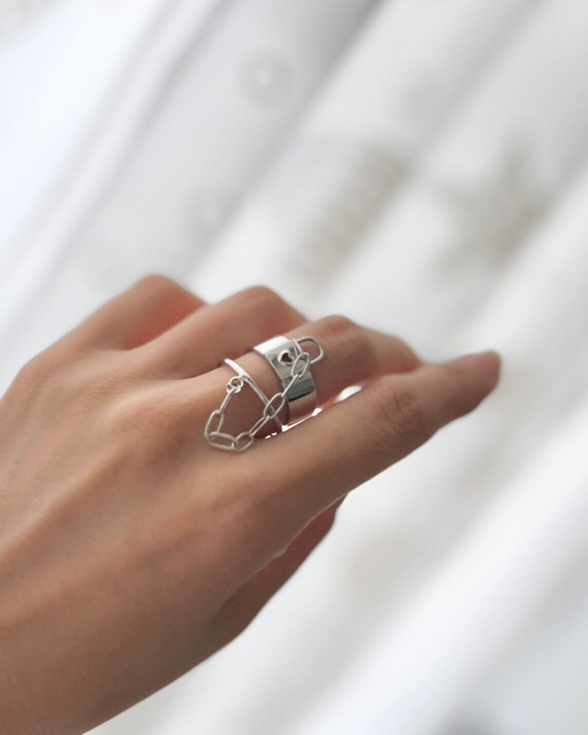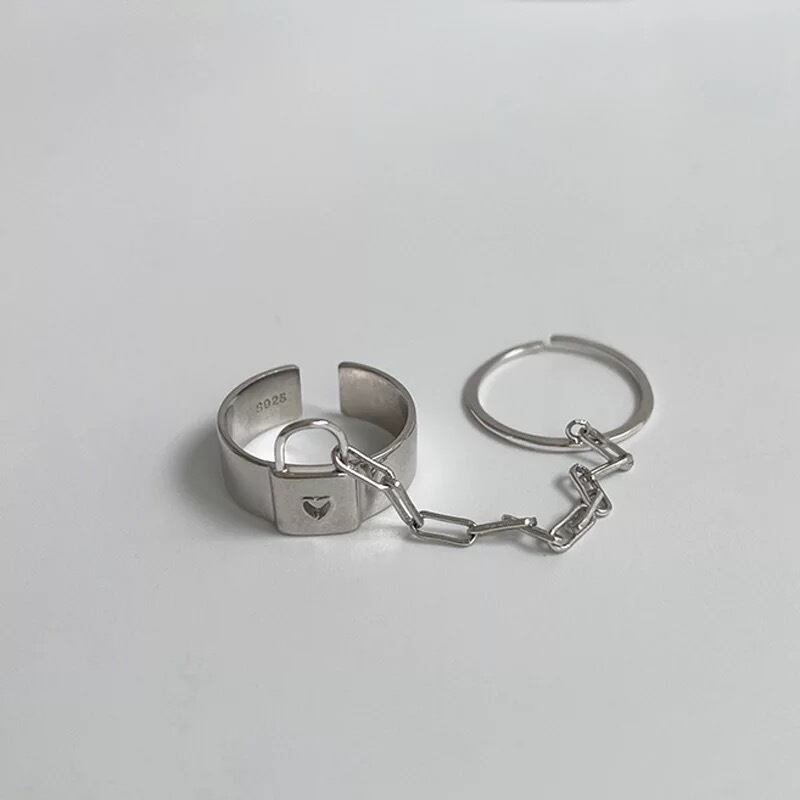 ハートの南京錠とチェーンに繋がれたリングが可愛いリング。
