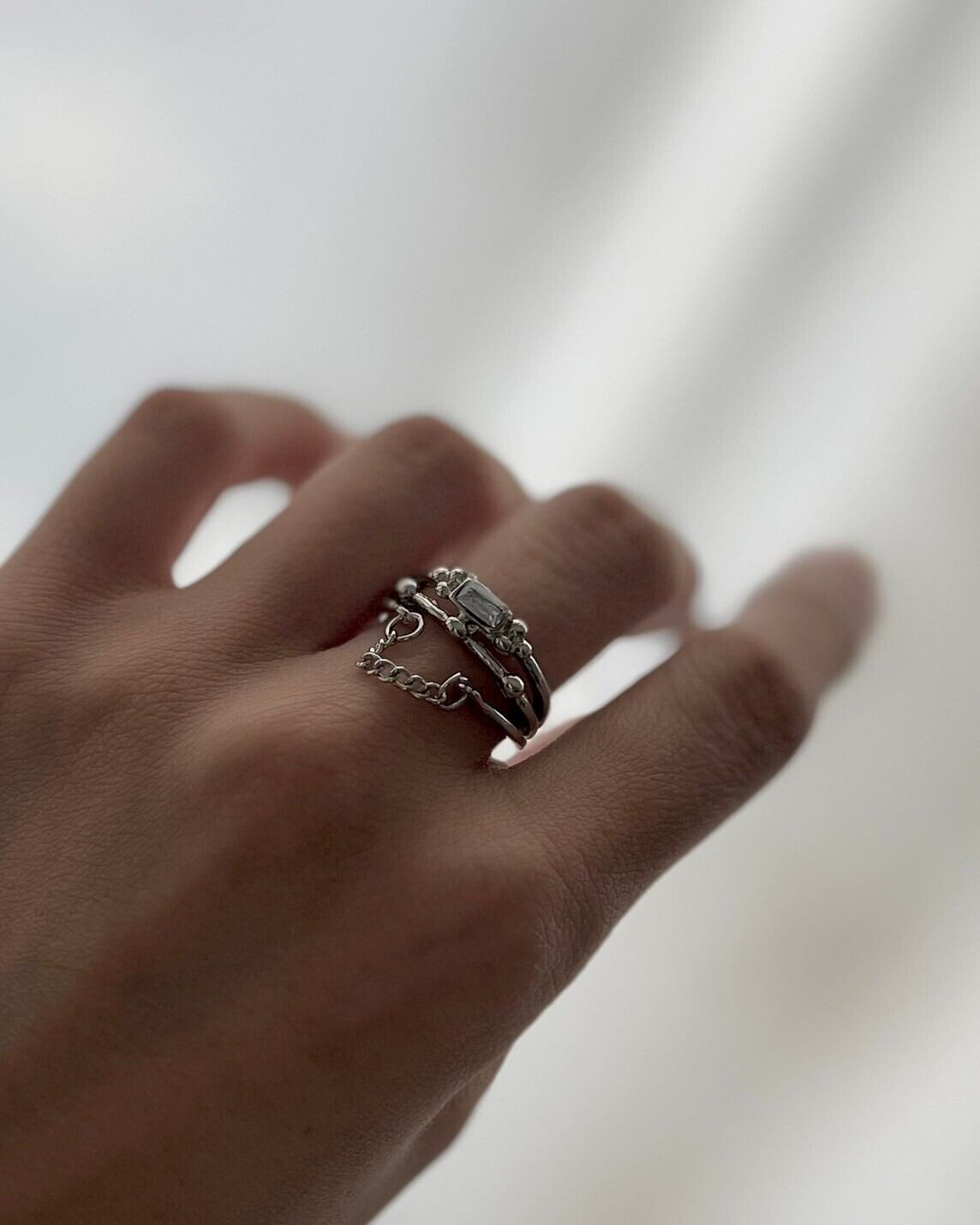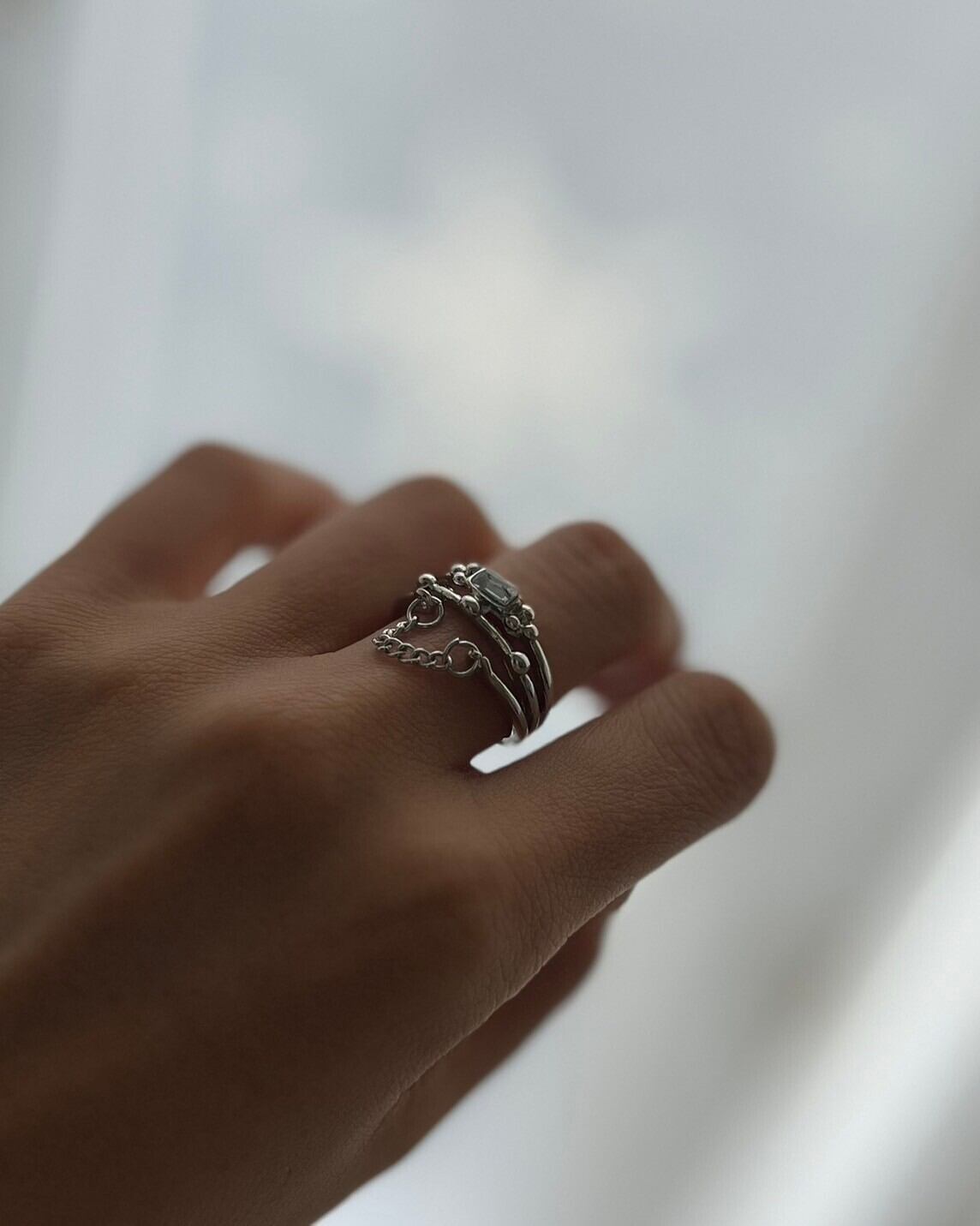 チェーンのデザインと長方形のストーンがキラキラと美しい特徴的リング。