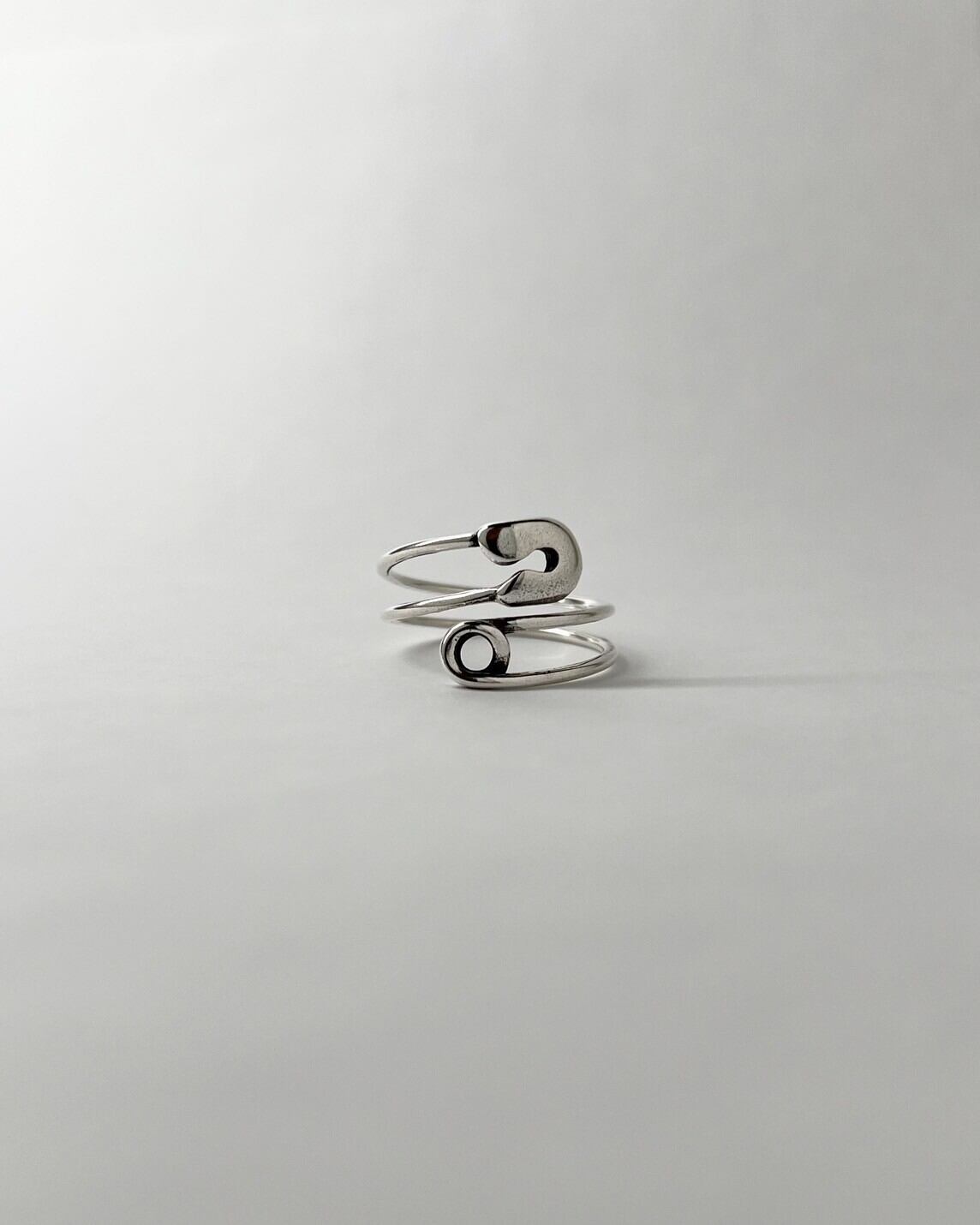安全ピンをぐるっと指に巻いたような特徴的なデザインが目を惹くリング。